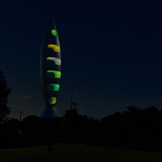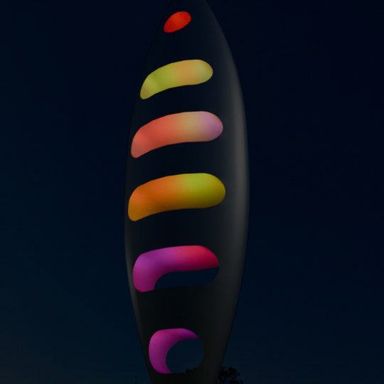 Holes in the form articulate an eye and ribs. They also provide light wells that disperse daytime light. At night they are illuminated by computer controlled LEDs that are mounted in each hole. Lighting can be constantly varied using computer algorithms that make sophisticated colour combinations that result in richly varied lighting hues. Also lighting sequences can be animated into rhythmic moving patterns. The animated lighting will be a major attraction for the work giving it ongoing interest without it being obtrusive or gaudy. Note that the artist is known for his work on generative computer processes and will be writing control software specifically for the sculpture.